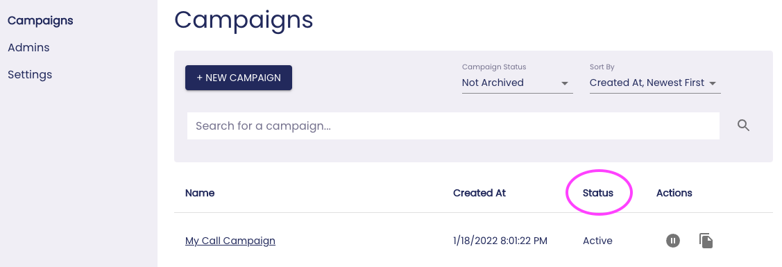 In your dialer admin interface, click the “Campaigns” menu option on the left-hand side of your screen to see a list of all the call campaigns that have been created in your account. On each call campaign’s row, the date and time it was created and its “status” (e.g., “Active,” “Draft,” “Complete,” “Stalled”) will be displayed, as well.