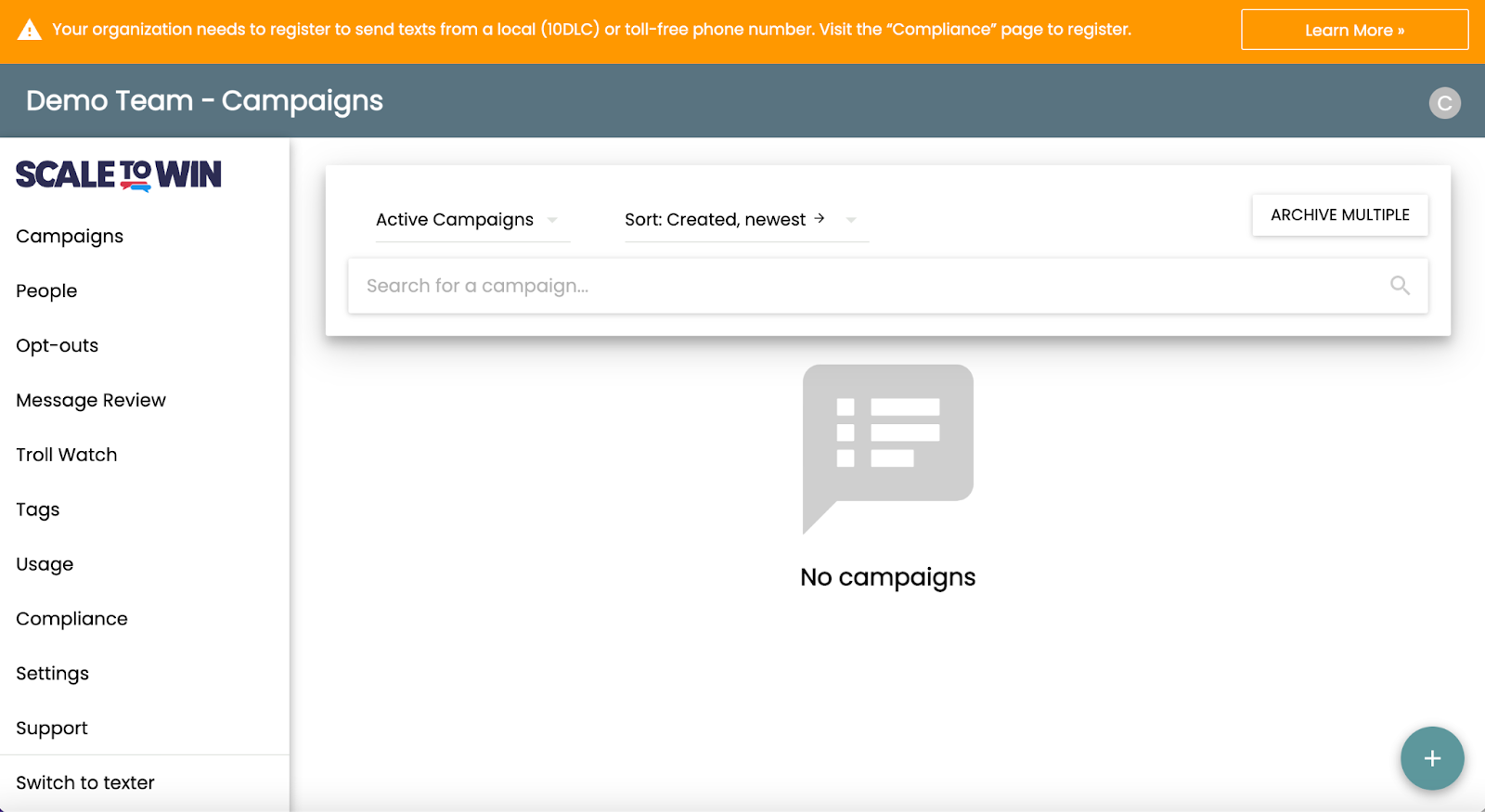 The backend of Spoke is where you’ll build campaigns, register for texting, and more.