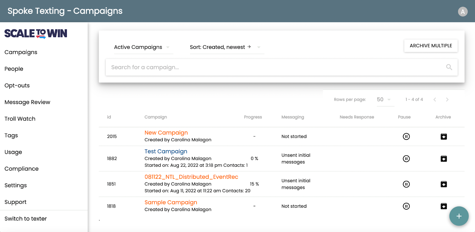 To build text campaigns, you’ll use the “Campaigns” page on the Spoke backend.