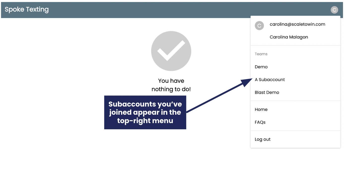 Once subaccounts are created and you’ve joined them, you can switch between them using the menu at the top right corner.