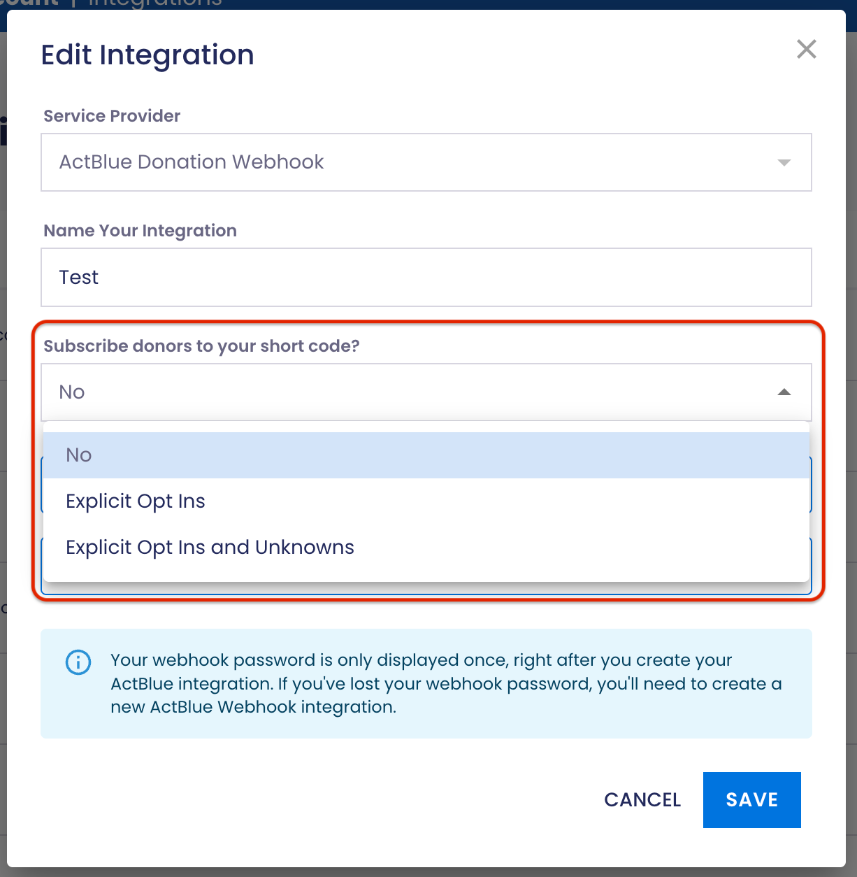 Click Add New Integration and choose "ActBlue Donation Webhook".