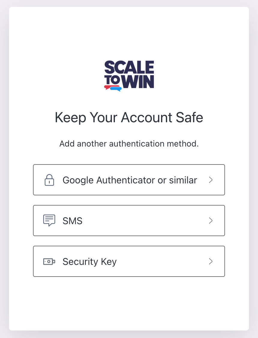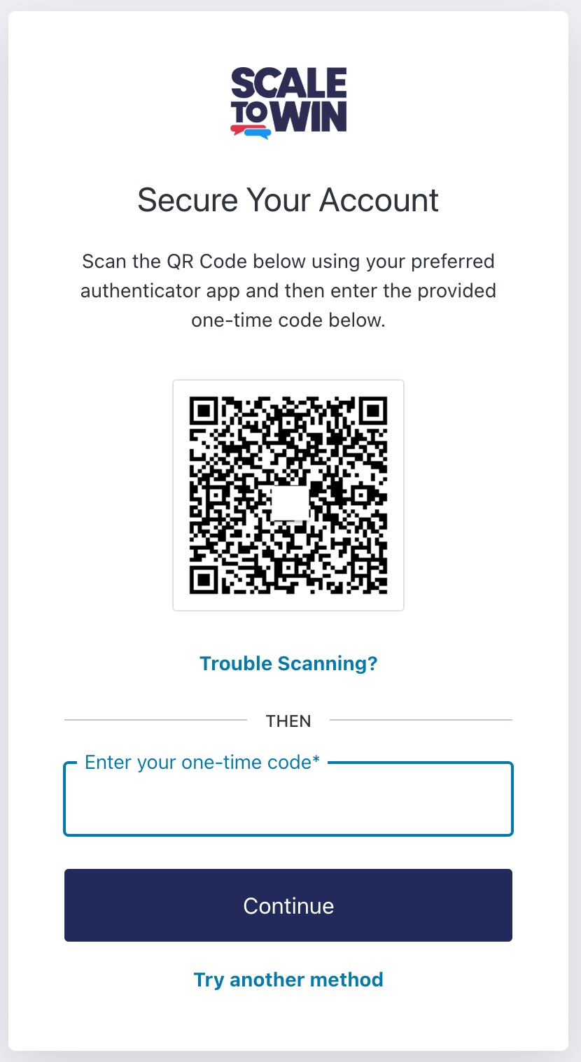 7. For the app option, download Google Authenticator (or your app of choice) onto your phone and use the in-app camera to scan the QR code. This adds Scale to Win Text to your authenticator app and provides a new 6-digit login code each time you login to your account. Enter the 6-digit code into the one-time code box and click Continue.