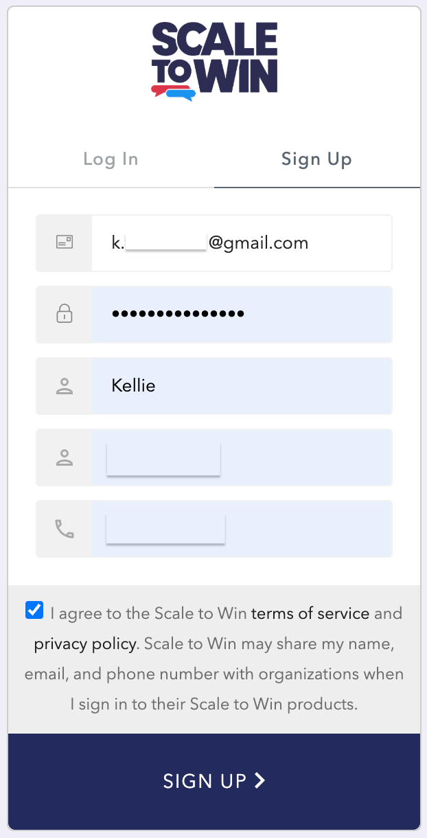 3. You are then directed to a Sign Up page. Enter your information, check the box agreeing to the Scale to Win terms of service and privacy policy, and click Sign Up.