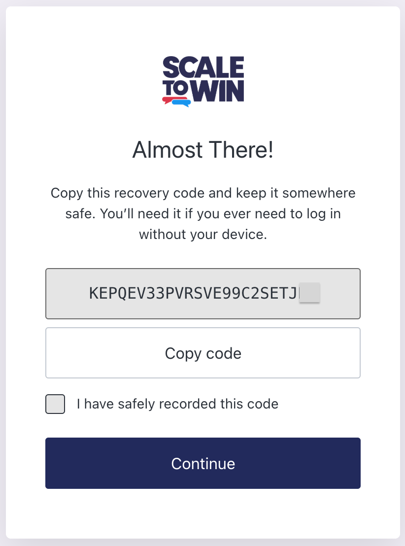 8. You are then prompted to copy a recovery code in the event you need it to log into your account. Save this code in a readily accessible place. Then click Continue.